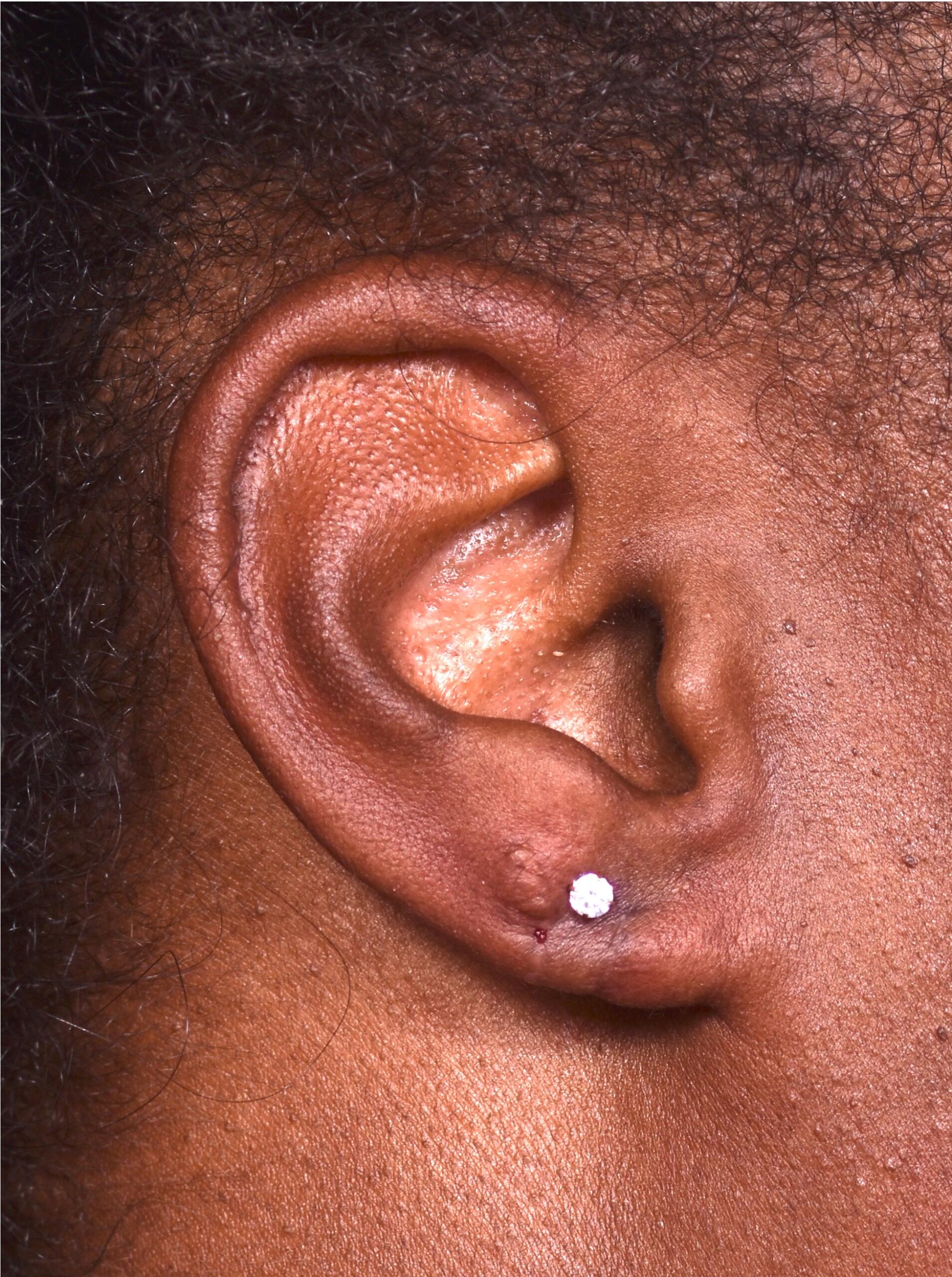 This 31-year-old woman wanted to treat her torn and stretched earlobe piercings; these had become traumatized after wearing heavy earrings as a teenager. She wanted to return to a single earlobe piercing after repair. Our Facial Plastic Surgeon Dr. Inessa Fishman treated the stretched and torn piercings with an earlobe repair, and re-pierced the earlobe 1.5 months after treatment. The patient is shown with excellent healing progress from her repair, and immediately after re-piercing.