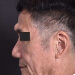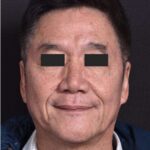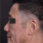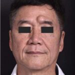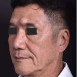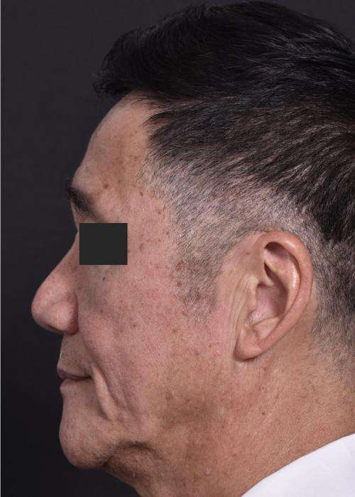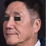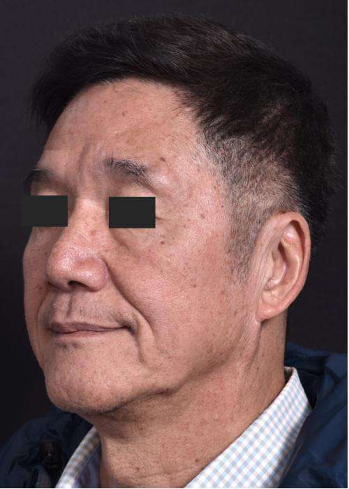 A 68-year-old man with a forehead lesion (a lipoma, which is usually a benign, slow-growing fatty tumor) was treated with excision. The treatment was performed with the help of local anesthetic and laughing gas in the office; the incision is placed within the patient’s naturally occurring forehead wrinkle. The patient is shown 6 months after treatment.