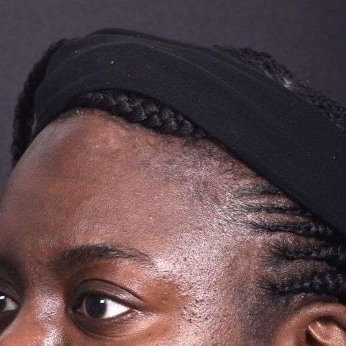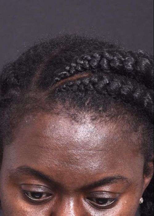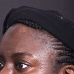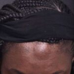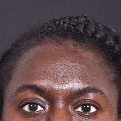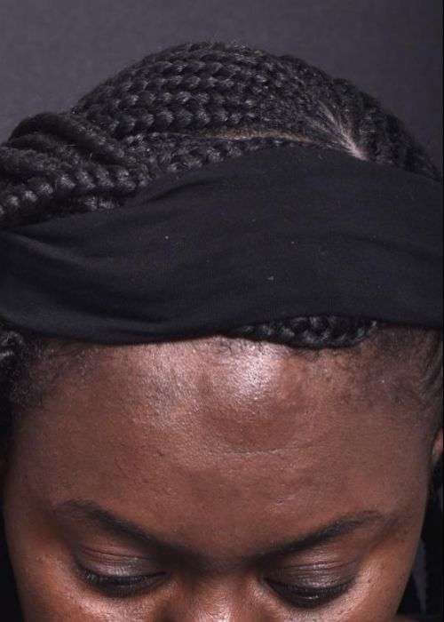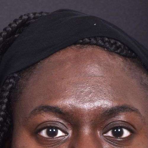A 39-year-old woman with a forehead lesion (a lipoma, which is usually a benign, slow-growing fatty tumor) was treated with excision. Dr. Inessa Fishman performed the treatment using local anesthetic (or numbing medicine) and laughing gas in the office. The incision is hidden behind the patient’s hairline. The patient is shown 6 months after treatment.