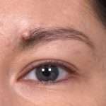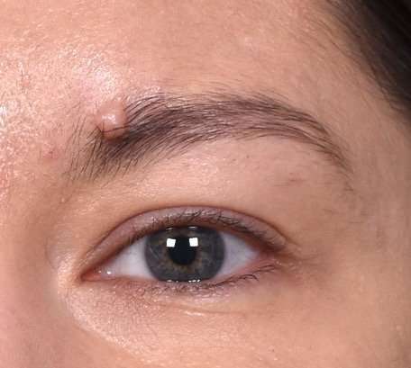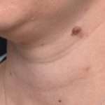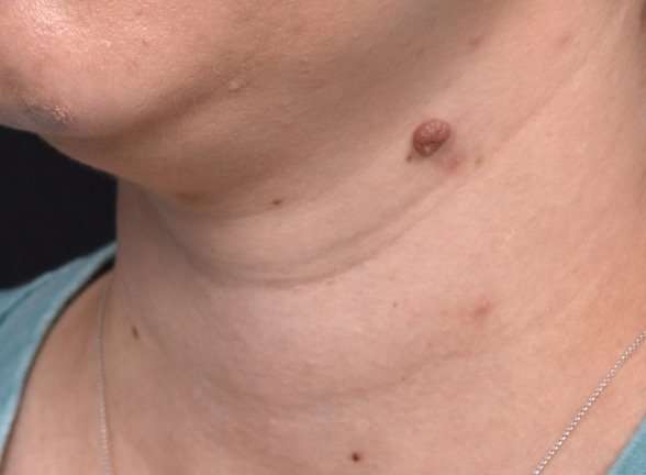 This 37-year-old woman was bothered by the appearance of a raised mole at her left eyebrow and neck.  Dr. Inessa Fishman removed these moles with an in-office procedure.  The patient is shown with excellent healing and a great outcome 6 months after treatment.